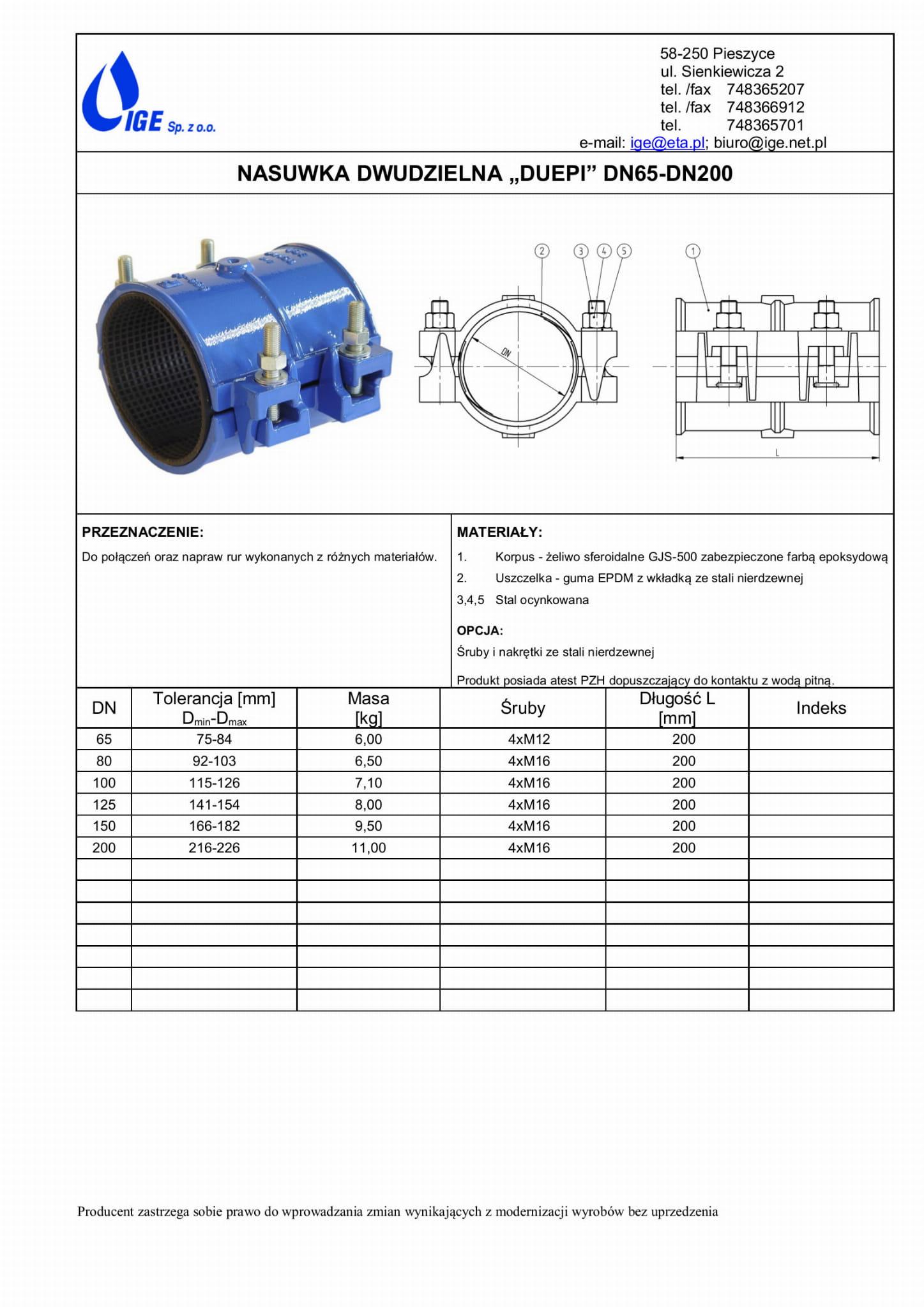 - korpus: żeliwo sferoidalne zabezpieczone farbą proszkową epoksydową,